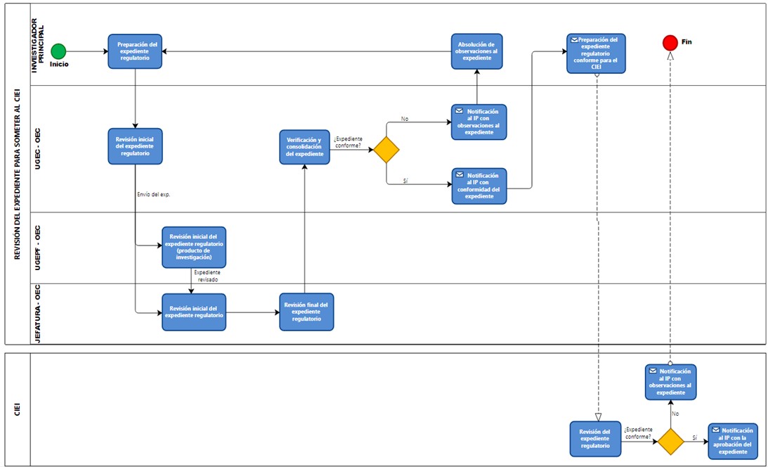 La OEC pone a disposición un flujograma referencial que describe el proceso interno de aprobación del expediente de un ensayo clínico en Cayetano Heredia: