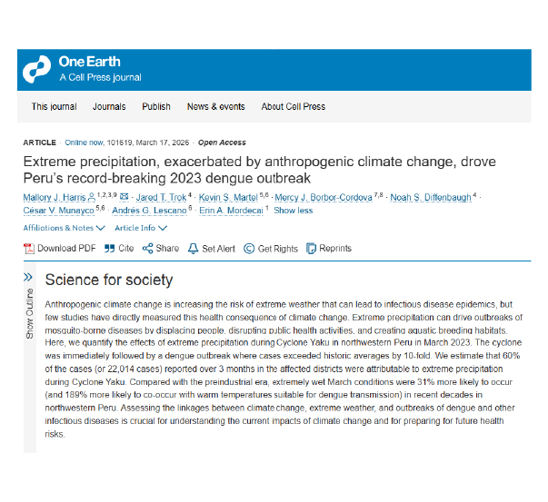El estudio, desarrollado en colaboración con la Escuela Superior Politécnica del Litoral de Ecuador, el Ministerio de Salud del Perú (MINSA) y la Universidad Peruana Cayetano Heredia, contó con la participación de los investigadores heredianos César Munayco, Kevin Martel y Andrés Lescano, y estimó que el 60% de los casos en los distritos más afectados estuvo directamente relacionado con lluvias intensas y altas temperaturas.
