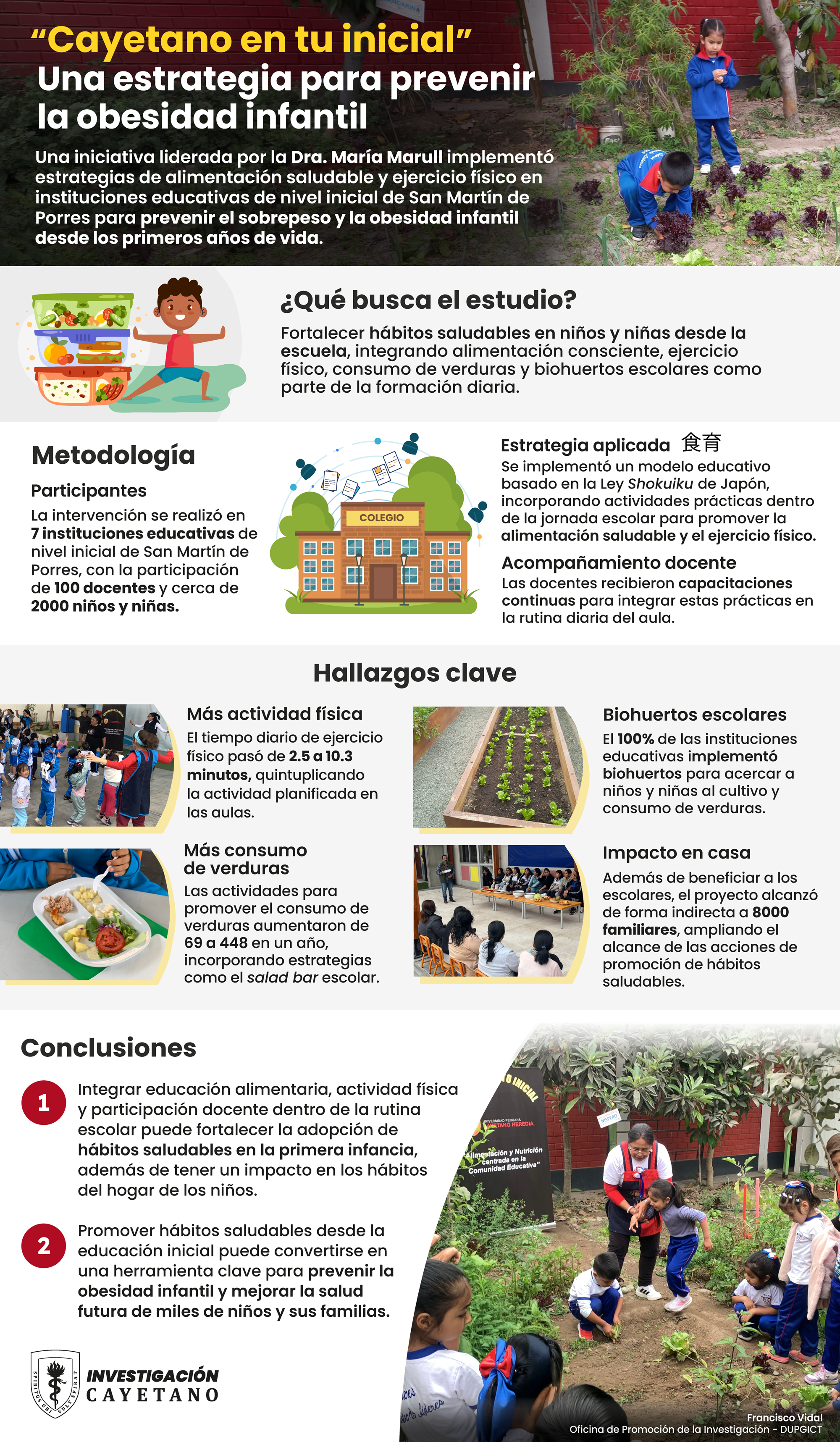 La obesidad infantil se ha convertido en uno de los principales desafíos de salud pública, y su prevención requiere intervenciones desde los primeros años de vida. Una iniciativa liderada por la Dra. María Marull implementó estrategias de alimentación saludable y ejercicio físico en instituciones educativas iniciales de San Martín de Porres, promoviendo hábitos saludables desde la infancia a través de un modelo basado en la Ley Shokuiku de Japón, que integra educación alimentaria, ejercicio físico y biohuertos escolares dentro de la rutina educativa.