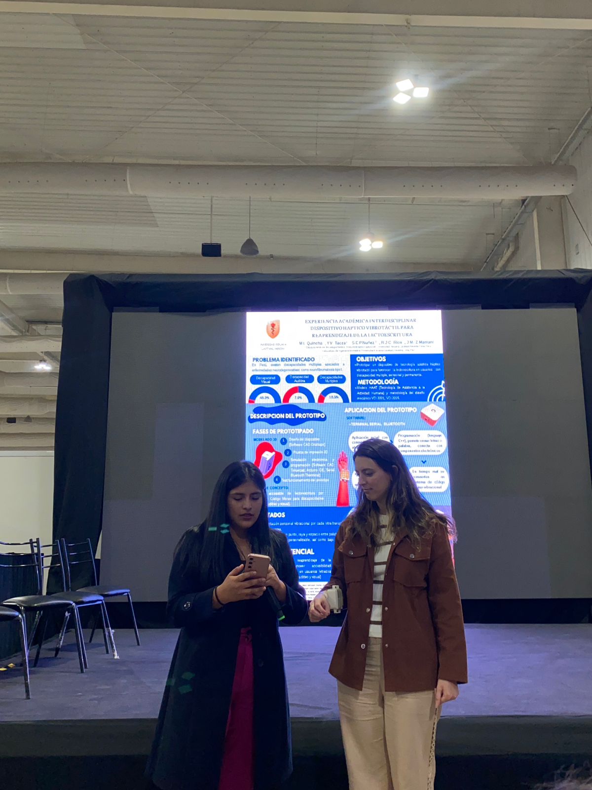 Entre los resultados presentados, Milagros destacó que el prototipo HapVi – fase 1 demostró la viabilidad de integrar un sistema vibracional en el reaprendizaje de la lectoescritura. En la fase 2, se proyecta realizar pruebas con usuarios letrados que presentan discapacidades permanentes, sensoriales o múltiples, a fin de evaluar su efectividad en contextos reales.