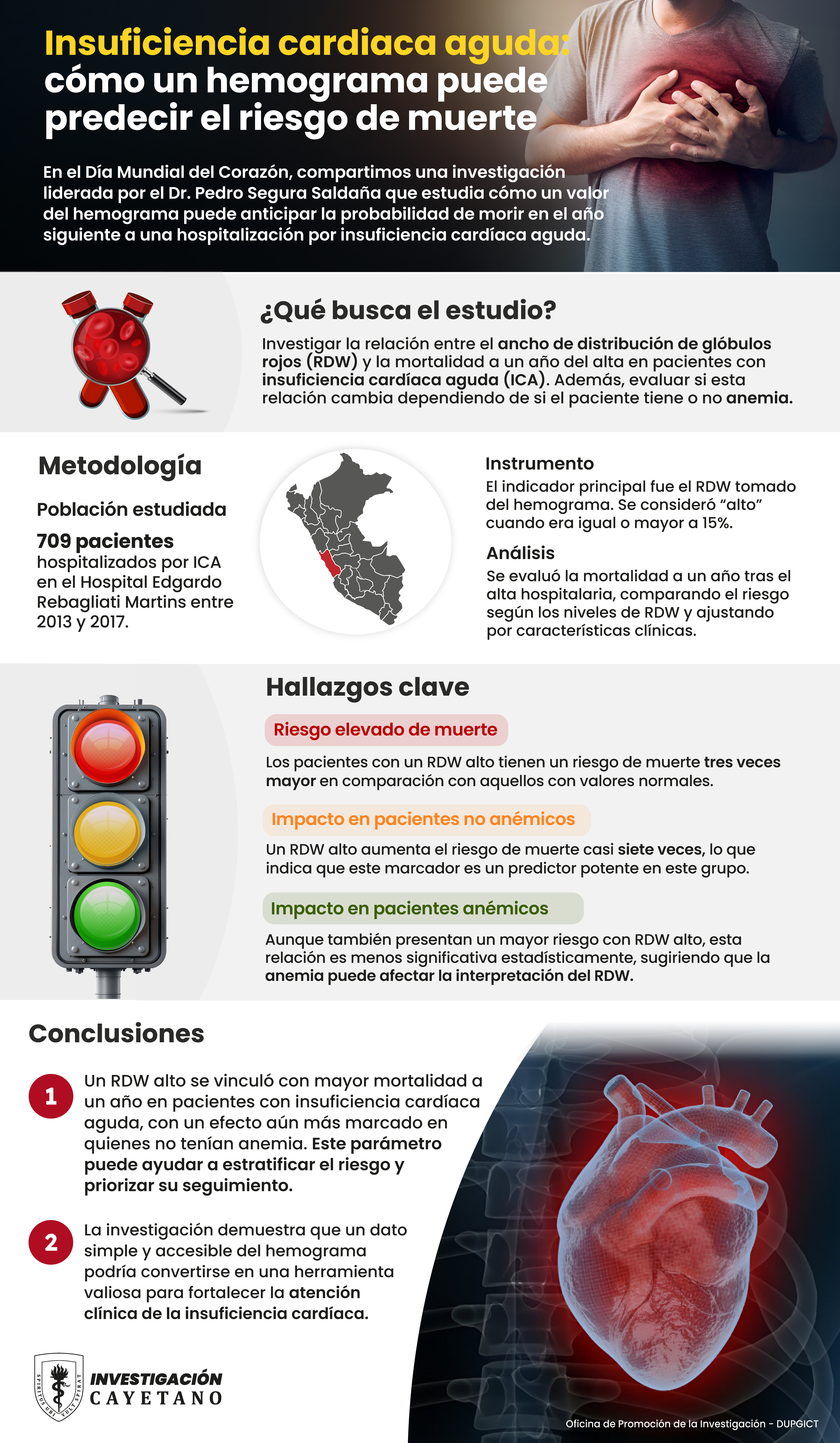 En el Día Mundial del Corazón, compartimos una investigación liderada por el Dr. Pedro Segura Saldaña, médico cardiólogo e investigador del Laboratorio de Ingeniería Biomédica de la Facultad de Ciencias e Ingeniería, que estudia cómo el ancho de distribución de glóbulos rojos (RDW) puede predecir el riesgo de mortalidad en pacientes que han sido hospitalizados por insuficiencia cardíaca aguda.