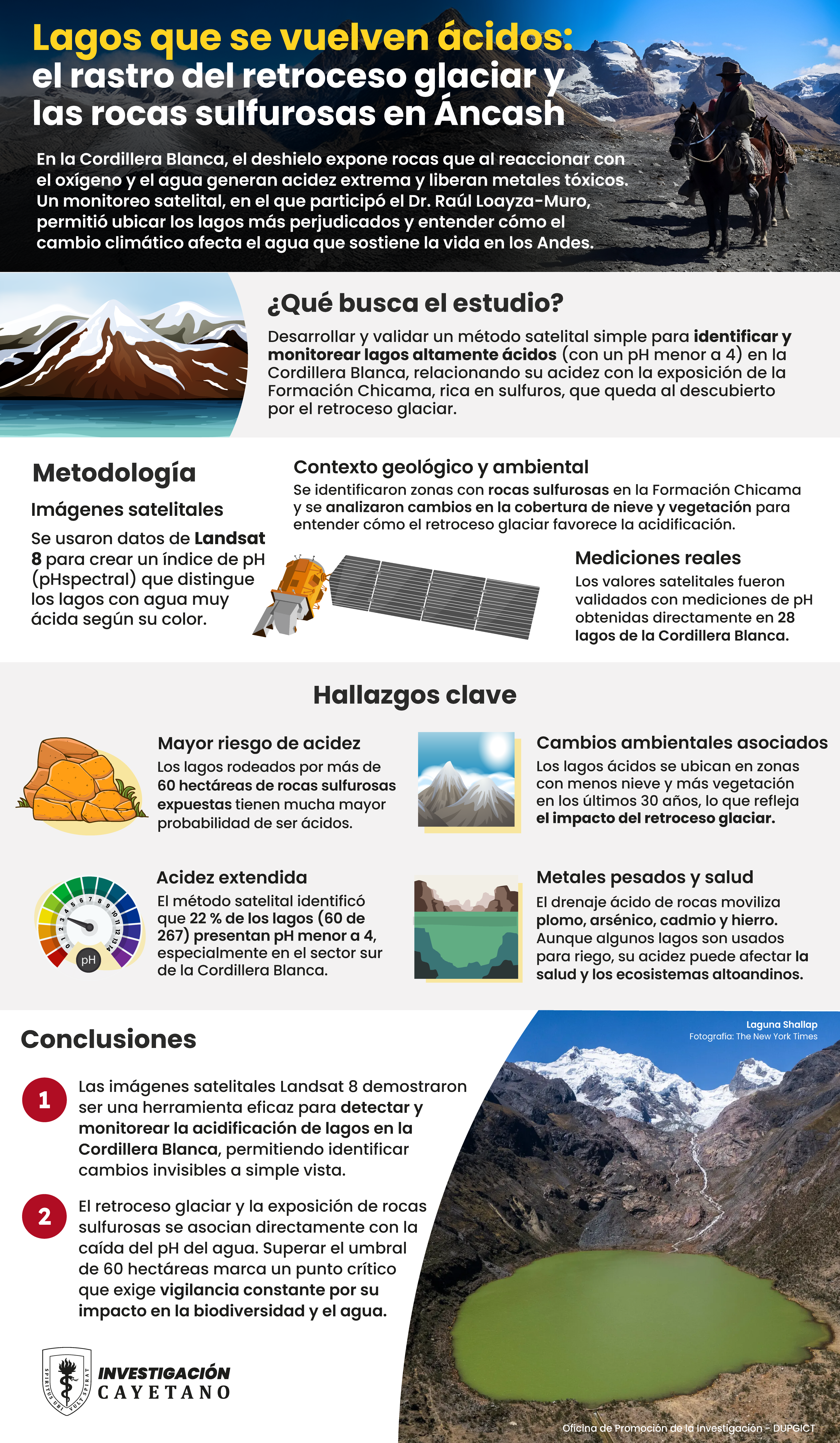 En la Semana Internacional para la Prevenci贸n de la Intoxicaci贸n por Plomo, compartimos una investigaci贸n en la que particip贸 el Dr. Ra煤l Loayza-Muro, jefe de la carrera de Biolog铆a y coordinador del Laboratorio de Ecotoxicolog铆a de Cayetano Heredia. El estudio revela que el deshielo no solo reduce las reservas de agua: tambi茅n est谩 alterando su composici贸n, liberando metales como plomo, ars茅nico y cadmio en los lagos altoandinos.