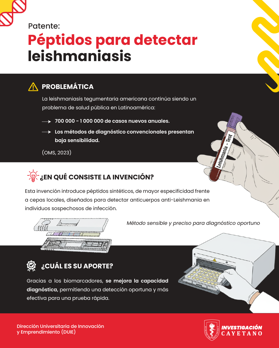 En 2013, la Universidad Peruana Cayetano Heredia presentó una solicitud de patente para péptidos sintéticos diseñados específicamente para detectar anticuerpos anti-Leishmania en individuos sospechosos de infección.