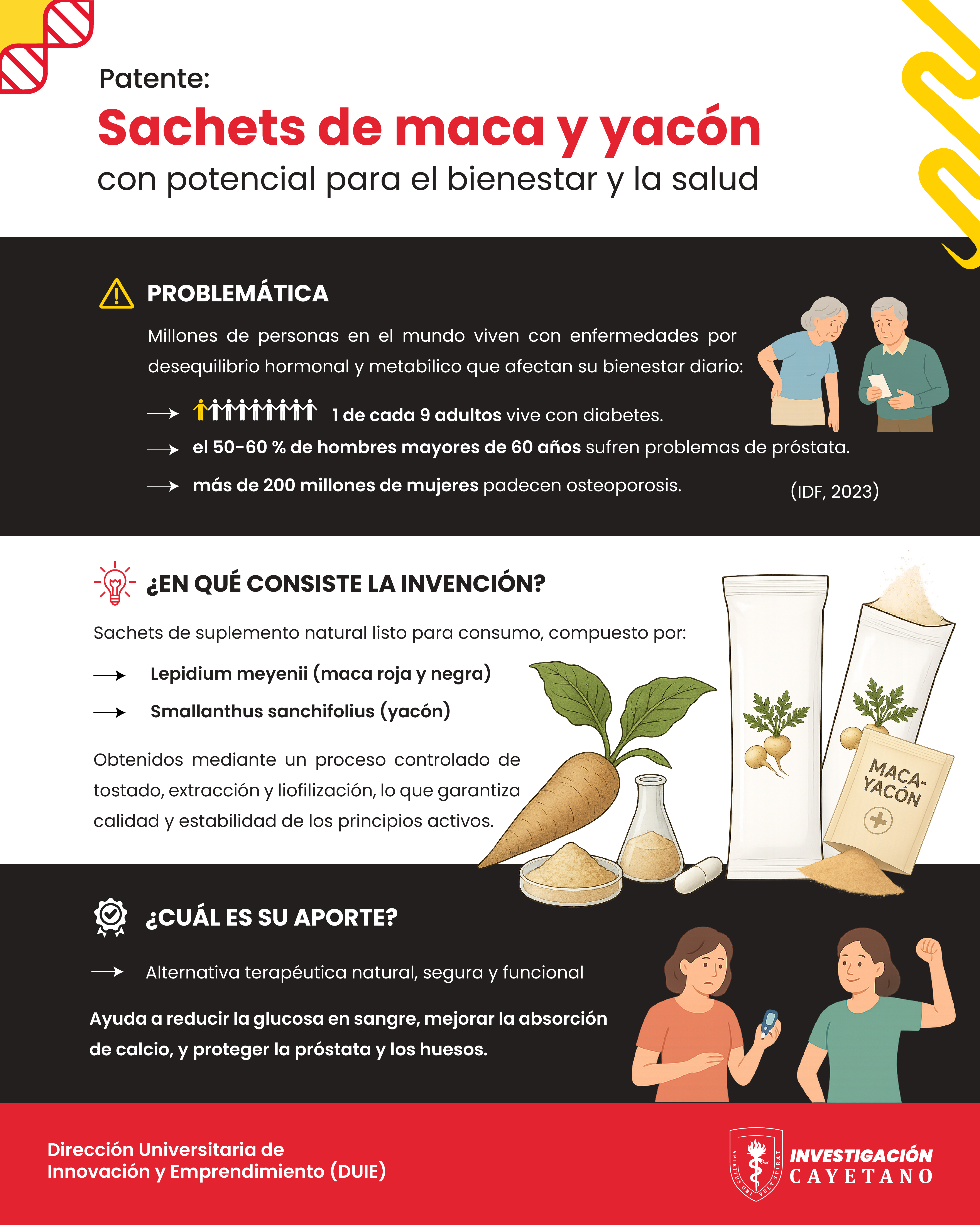 En 2011, investigadores de Cayetano desarrollaron y patentaron una composición innovadora que combina extractos de maca roja y negra con yacón, elaborada mediante procesos controlados de tostado, extracción y liofilización.