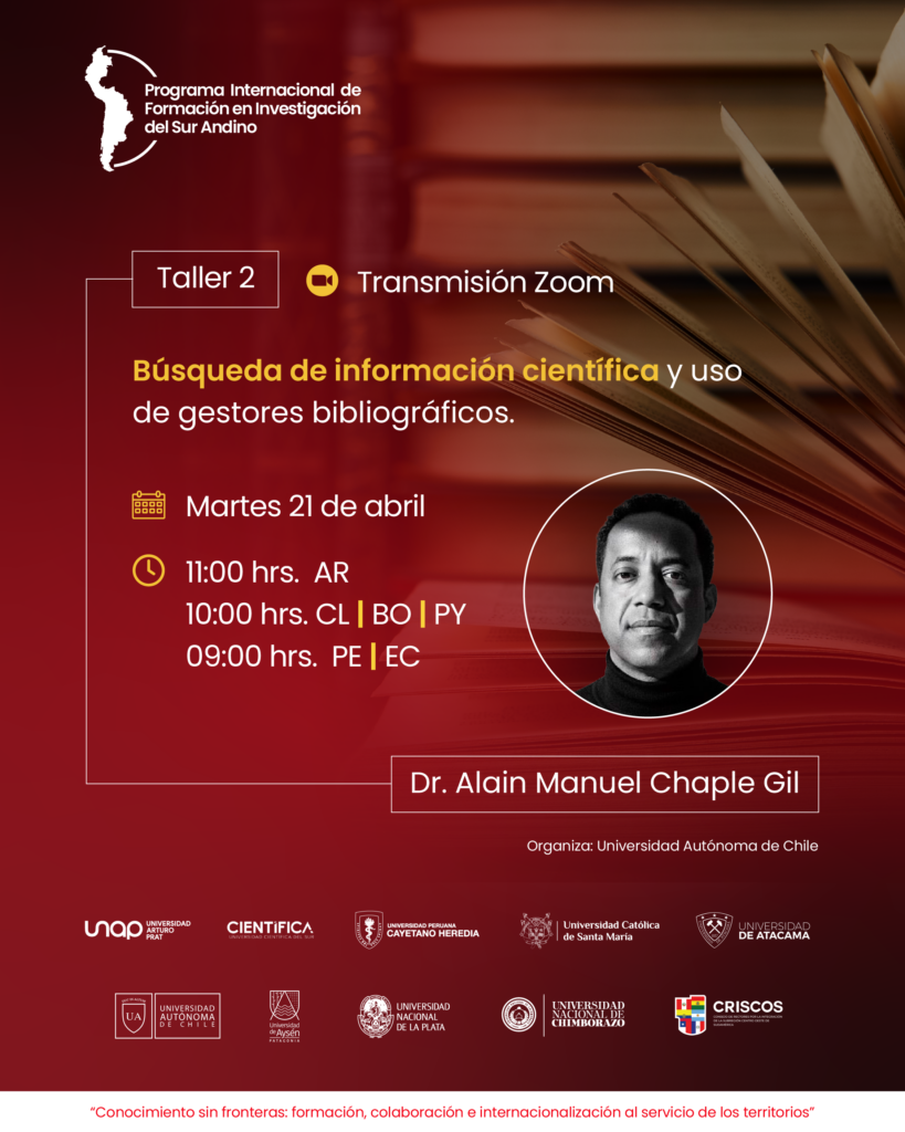 El Programa Internacional de Formación en Investigación del Sur Andino alista su segundo taller, titulado «Búsqueda de información científica y uso de gestores bibliográficos», orientado a fortalecer las competencias en la identificación, organización y gestión eficiente de información académica.