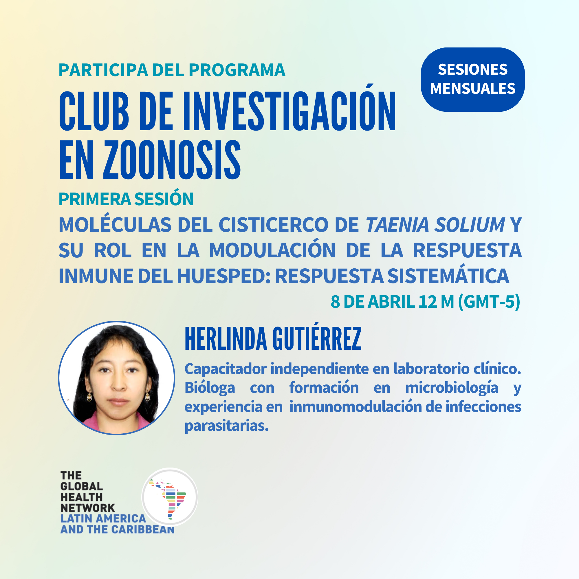 En esta sesión inaugural, la bióloga Herlinda Gutiérrez De la Cruz presentará la ponencia “Moléculas del cisticerco de Taenia solium y su rol en la modulación de la respuesta inmune del huésped: revisión sistemática”, en la que abordará los principales hallazgos sobre los mecanismos de inmunomodulación asociados a este parásito de relevancia en salud pública.